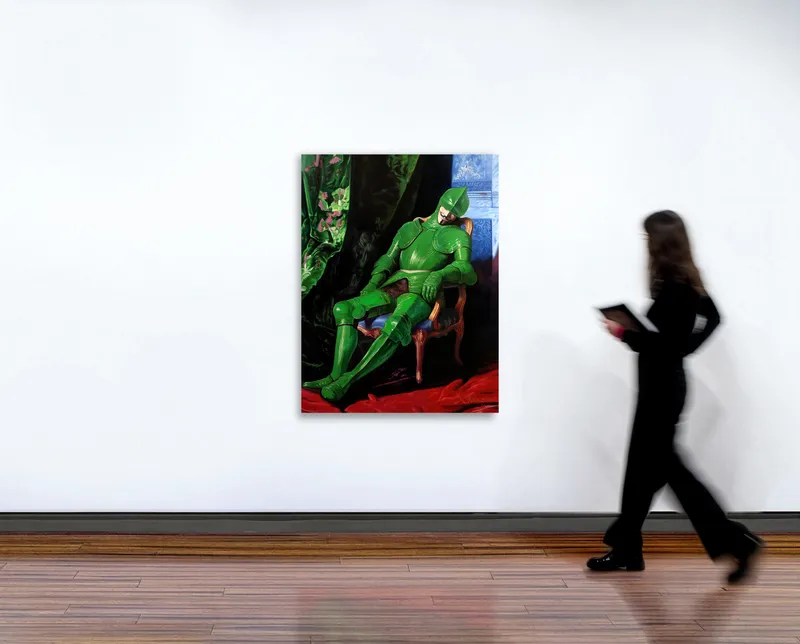 A pair of allegorical knights recline in suspended states of consciousness, their lacquered armor rendered in the chromatic language of market ascent and collapse — green and red both heraldry and chart. Drawing on Arthurian myth and Renaissance portraiture, the works recast the trader as soldier, caught between dream and drift where speculation becomes warfare and identity dissolves beneath the symbols of capital.