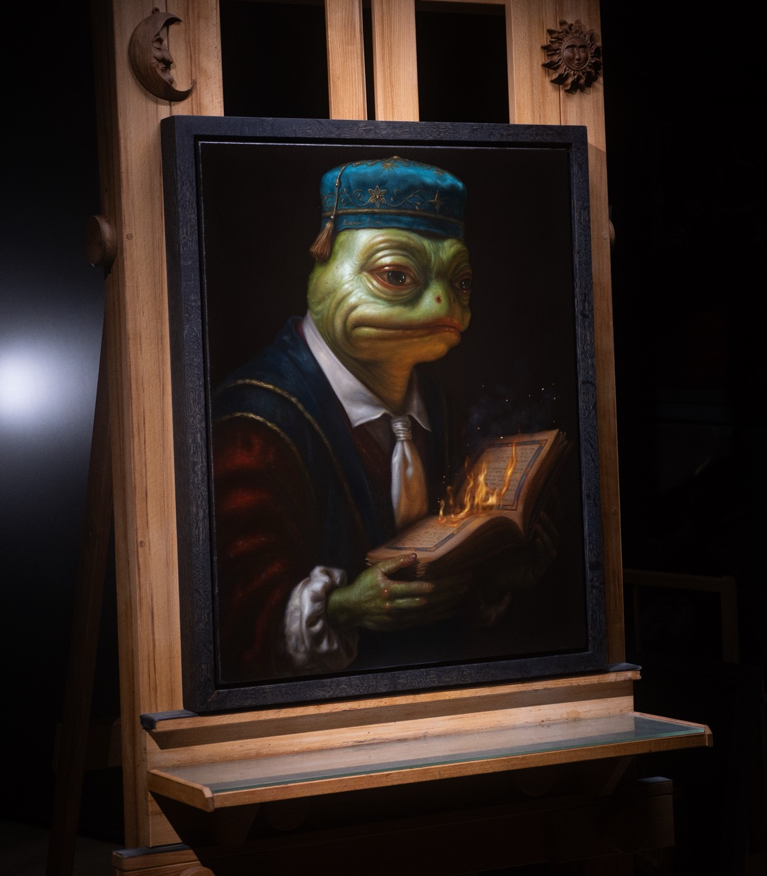 Pepeus Flamel depicts Pepeus Flamel — a mythical mage and alchemist, holding an ancient tome inscribed with the names of all known memes as a secret hermetic spell. The pages, impervious to fire, are enveloped in flames, symbolizing the transformation of free knowledge that resists both prohibition and the passage of time.